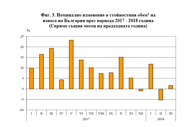 През периода януари - март 2018 г. от България са изнесени стоки общо на стойност 12 464.7 млн. лв. и в сравнение със същия период на 2017 г. износът се увеличава с 2.4% (табл. 1 и 2 от приложението).