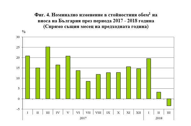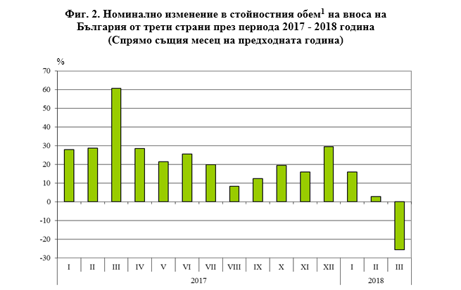 Вносът на България от трети страни през периода януари - март 2018 г. намалява с 4.0% в сравнение със същия период на 2017 г. и е на стойност 4 955.2 млн. лева (по цени CIF) (табл. 1 и 2 от приложението). Най-голям е стойностният обем на стоките, внесени от Руската федерация, Турция, Китай и Сърбия (табл. 3 от приложението).