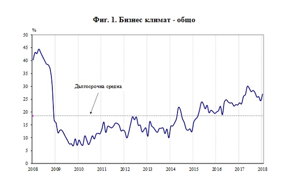 /КРОСС/ През януари 2018 г. общият показател на бизнес климата се повишава с 2.6 пункта спрямо декември 2017 година. Подобрение на стопанската конюнктура е регистрирано в промишлеността и сектора на услугите, докато в строителството и търговията на дребно показателят остава приблизително на нивото си от предходния месец, сочи проучване на Националния статистически институт.