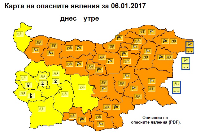 Предупреждение за опасно време е в сила за цялата страна за 6 януари. Оранжев код за силен вятър и сняг е обявен за 20 области на страната. Кодът е в сила за областите Монтана, Враца, Плевен, Ловеч, Габрово, Велико Търново, Русе, Търговище, Разград, Силистра, Добрич, Варна, Бургас, Ямбол, Сливен, Стара Загора, Хасково, Кърджали и Смолян. Вятърът ще бъде силен вятър от север-североизток с пориви до 22-24 м/с. Ще има валежи от сняг и в Северна България ще се образува снежна покривка около 25 см, в планинските части и повече. Има условия за снегонавявания. В Южна България ще има условия за поледици.