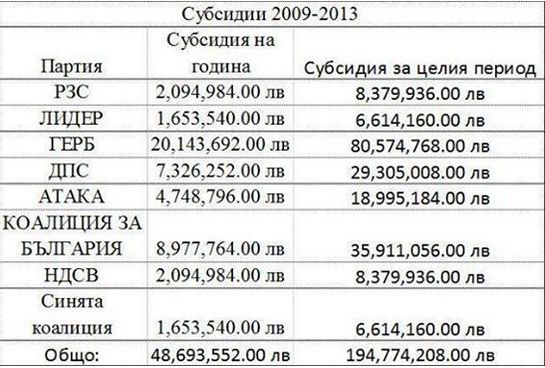 От таблицата става ясно, че за периода от ГЕРБ са получили над 80.5 млн.лв. или по над 20,143 млн.лв. годишно, Коалиция за България - близо 36 млн.лв. или по близо 9 млн.лв.годишно. ДПС са получили като субсидия близо 30 млн.лв. или по около 7.3 млн.лв. за всяка от годините. Партийната субсидия на „Атака" е в размер на близо 19 млн.лв. за периода 2009-2013 г. Това прави по малко над 4.7 млн.лв. годишно.