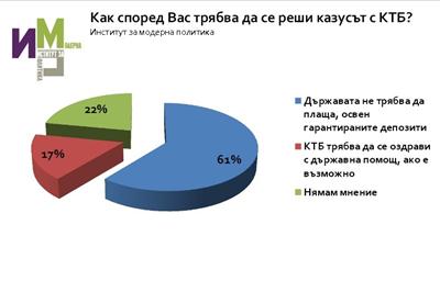 17% от респондентите смятат, че КТБ трябва да се оздрави с държавна помощ, т.е. да бъдат спасени големите влогове на физически лица и фирми. Около една пета от респондентите - 22 % нямат мнение по темата.