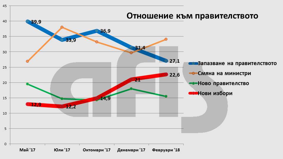 /КРОСС/ Доверието във властта отново се разклаща, идеята за нови избори набира скорост. До такъв извод стигат от социологицеската агенция АФИС след проучване за електоралната нагласа за месец февруари.