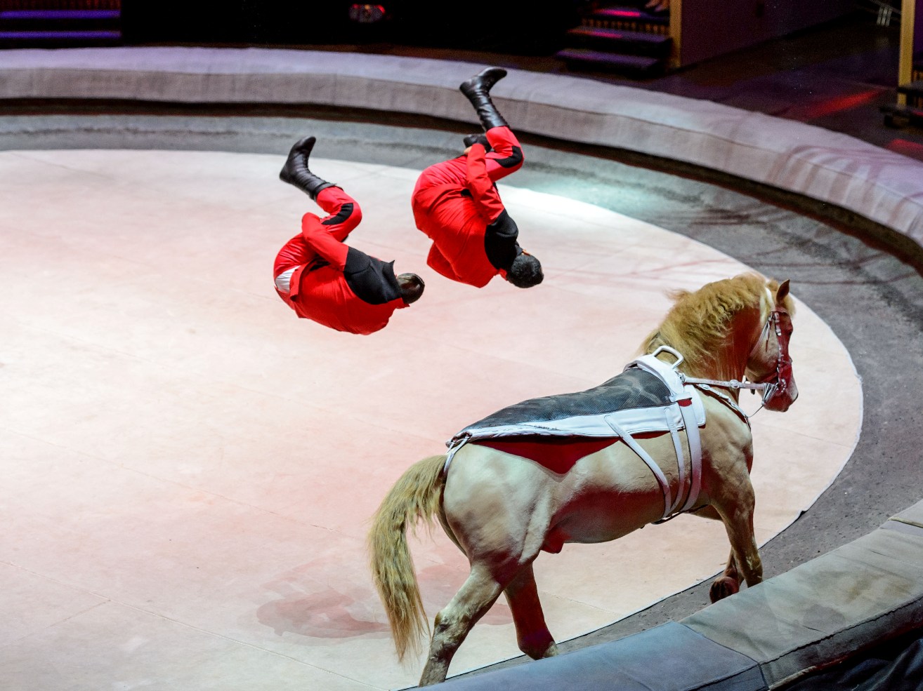 На манежа, братя Запашние ще представят уникална атракция с изпълнение на салтомортале /смъртен скок/ и други опасни, акробатични номера върху препускащи коне. Децата ще се забавляват с дресурата на кучета.