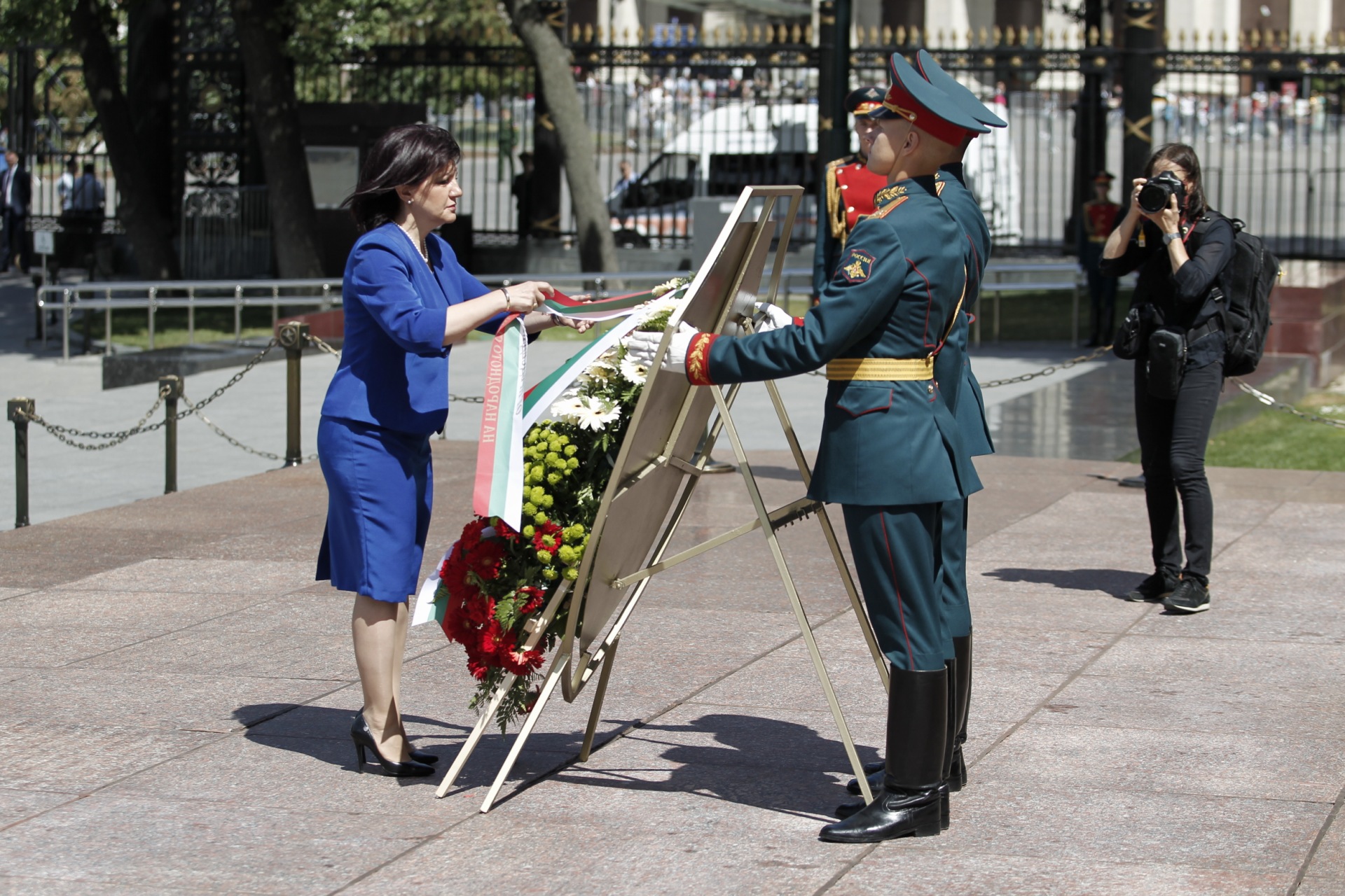 /КРОСС/ С полагане на венец на гробницата на Незнайния воин в Александровската градина до стената на Кремъл започна официалното посещение в Москва на българската парламентарна делегация, водена от председателя на Народното събрание Цвета Караянчева.