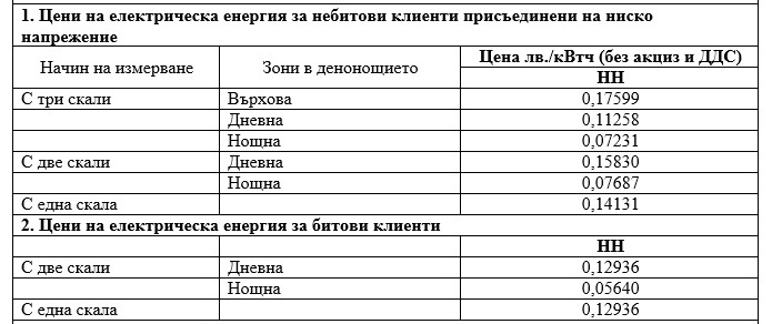 С Решение № Ц-19 от 30.06.2016 г. Комисията за енергийно и водно регулиране утвърждава следните цени за „ЧЕЗ Електро България" АД, считано от 01.07.2016 г.