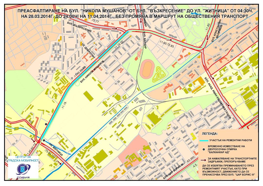 От 07.00 часа на 28.03.2014 г. до 24.00 часа на 04.04.2014 г. се забранява влизането на пътни превозни средсва в дясната половина от пътното платно на бул. „Никола Мушанов" между бул. „Възкресение" и ул. „Добротич" и по бул. „Никола Мушанов" между ул. „Добротич" и ул. „Житница". Движението на автомобили ще се извършва двупосочно в лявата половина от пътното платно на бул. „Никола Мушанов" между бул. „Възкресение" и ул. „Добротич" и по бул. „Никола Мушанов" между ул. „Добротич" и ул. „Житница".