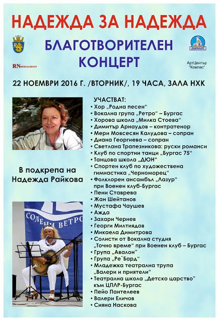Нека доставяйки си удоволствие от общуването с различните изкуства и талантливите представители на артистичен Бургас, да проявим своето милосърдие и способност за взаимопомощ и дарим Надежда на Надежда.