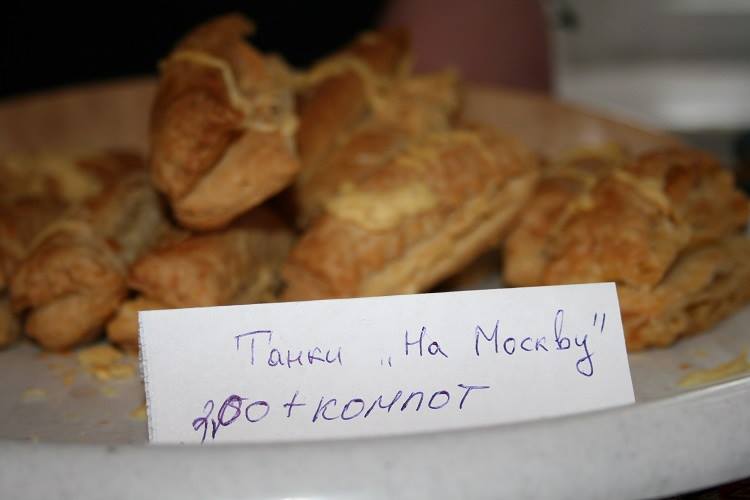 Така, на благотворителния базар бяха представени сладкарските изделия с гръмките наименования „Танкове за Москва”, „Бандеровски” пирог, „Жълто-сини звезди в Кремъл” и „Мозъкът на Жириновски”, а като напитка към тях се предлагаше „Кръв от руски бебета”. Фото- и видеоматериалите от интересното събитие се разпространиха мигновено из интернет пространството и предизвикаха възмущение сред потребителите.