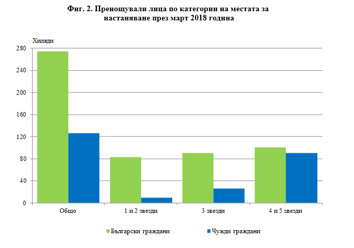 Броят на пренощувалите лица в местата за настаняване през март 2018 г. се увеличава с 4.8% в сравнение със същия месец на 2017 г. и достига 400.4 хил., като е регистрирано увеличение с 5.2% при българите и с 3.9% при чужденците. Българските граждани, нощували в местата за настаняване през март 2018 г., са 274.2 хил. и са реализирали средно по 1.9 нощувки. Чуждите граждани са 126.2 хил., като 71.9% от тях са нощували в хотели с 4 и 5 звезди и са реализирали средно по 2.5 нощувки