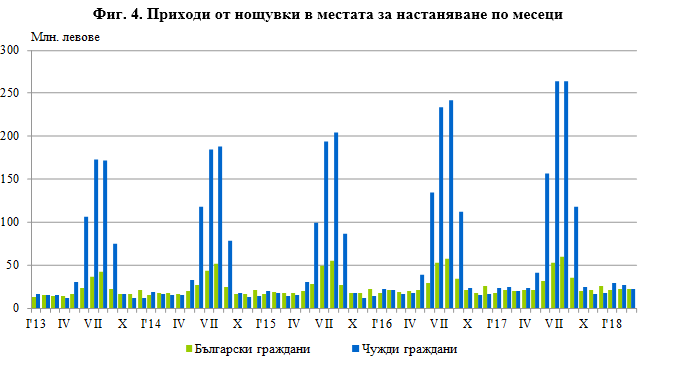 Приходите от нощувки през март 2018 г. достигат 44.9 млн. лв., или с 12.9% повече в сравнение с март 2017 година. Регистрирано е увеличение на приходите както от български граждани - с 13.2%, така и от чужди граждани - с 12.5%.