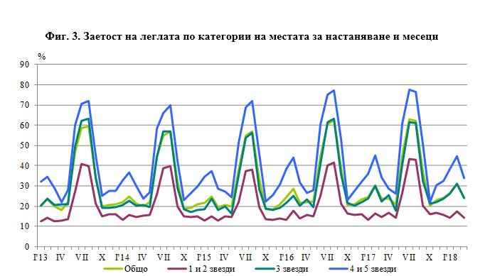 Общата заетост на леглата в местата за настаняване през март 2018 г. е 24.1%, като се увеличава с 0.5 процентни пункта в сравнение с март 2017 година. Най-висока е заетостта на леглата в хотелите с 4 и 5 звезди - 33.8%, следват местата за настаняване с 3 звезди - 24.2%, и с 1 и 2 звезди - 14.3%.