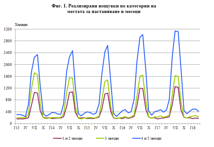 2018 г., е 832.9 хил., или с 6.4% повече в сравнение със същия месец на предходната година, като най-голямо увеличение на нощувките (с 9.9%) се наблюдава в местата за настаняване с 3 звезди.