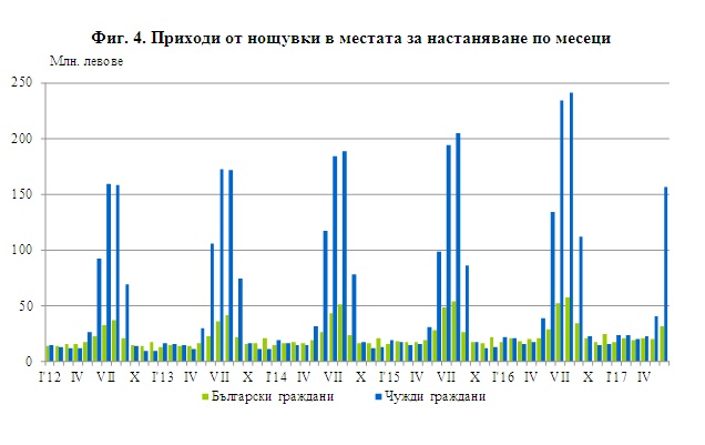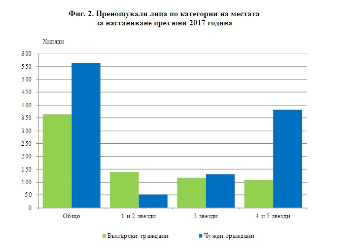 Броят на пренощувалите лица в местата за настаняване през юни 2017 г. се увеличава с 9.8% в сравнение със същия месец на 2016 г. и достига 926.9 хил., като е регистрирано увеличение с 14.3% при чужденците и с 3.4% при българите. Българските граждани, нощували в местата за настаняване през юни 2017 г., са 363.9 хил. и са реализирали средно по 2.4 нощувки. Чуждите граждани са 563.0 хил., като 67.9% са нощували в хотели с 4 и 5 звезди и са реализирали средно 5.3 нощувки.