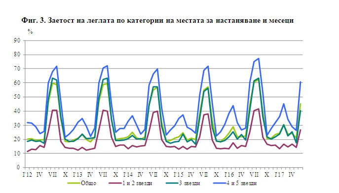 Общата заетост на леглата в местата за настаняване през юни 2017 г. е 45.2%, като се увеличава с 0.4 процентни пункта в сравнение с юни 2016 година. Най-висока е заетостта на леглата в хотелите с 4 и 5 звезди - 60.7%, следвани от местата за настаняване с 3 звезди - 40.4%, и с 1 и 2 звезди - 26.5%.
