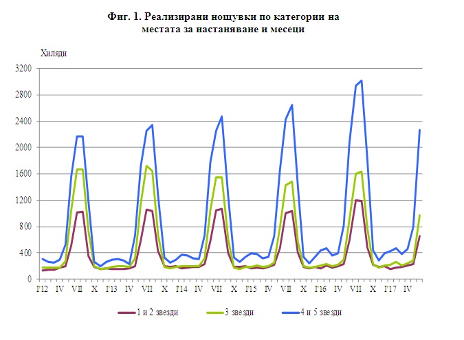 През юни 2017 г. в хотелите с 4 и 5 звезди са реализирани 67.0% от общия брой нощувки на чужди граждани и 28.1% - на българи. В местата за настаняване с 3 звезди са осъществени 23.6% от нощувките на чужди граждани и 29.6% - на българи, докато в останалите места за настаняване (с 1 и 2 звезди) те са съответно 9.4 и 42.3%.