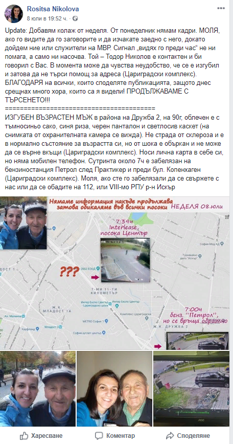 "Единствените реални "стъпки" на дядо са "Цариградски комплекс", 6:50ч - локалното на Цариградско шосе от страната на Интер Експо Център, Interlease 7:39ч; до хотел ATM 7:45ч. След това няма данни накъде е преминал – дали пресича и отива към The Мall или Младост. От камерите на големия блок в Дружба и камерите на Очна клиника Vision не е засечен в периода до 10ч", пише внучката му Росица Николова.