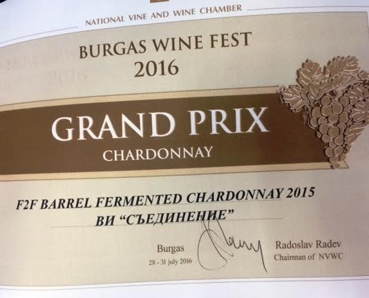 Титлата Grand Prix беше отредена на F2F Chardonnay Barrel Fermented 2015. Енолозите го описват с „Брилянтен златистозелен цвят, пленяващ букет с аромат на зрели летни плодове и екзотичен дъх - кайсия, праскова, цитрус, passion fruit, нотка ванилия и маслен кейк. Обемно начало, плодова сочност и пълнота са в хармония с една изкусна барикова зрялост и сетивен вкусов спомен". Любителите могат да го открият в добрите заведения и ресторантите, където предимно се предлага то.