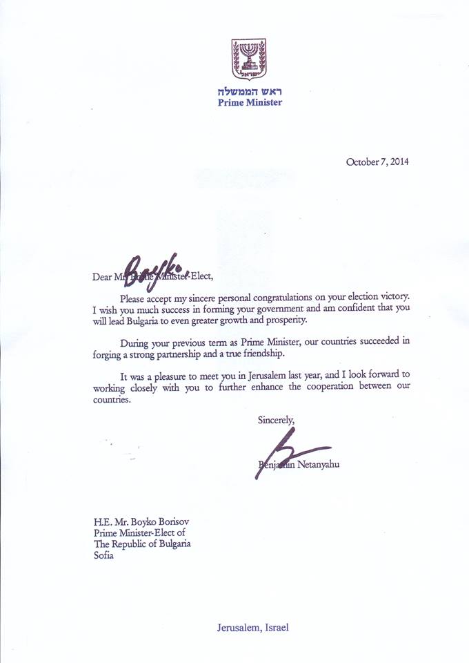 „Желая ви успех при съставянето на правителството. Убеден съм, че ще водите България към още по-голям напредък и просперитет. При предишния Ви премиерски мандат нашите страни успяха да изковат силно партньорство и истинско приятелство. За мен бе удоволствие да Ви посрещна в Йерусалим миналата година и очаквам с нетърпение да работим отново заедно за задълбочаване на сътрудничеството между нашите държави", пише още в писмото на премиера Нетаняху.