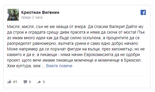 „Мисля, мисля, сън не ме хваща от вчера. Да спасим Валери! Дайте му да строи и оградата срещу диви прасета и няма да скочи от моста! Пък аз имам много идеи как да бъде силно оскъпена, а процентите да се разпределят равномерно, вълчата урина е само едно добро начало.