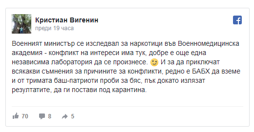 "Военният министър се изследвал за наркотици във Военномедицинска академия - конфликт на интереси има тук, добре е още една независима лаборатория да се произнесе. ;) И за да приключат всякакви съмнения за причините за конфликти, редно е БАБХ да вземе и от тримата баш-патриоти проби за бяс, пък докато излязат резултатите, да ги постави под карантина."