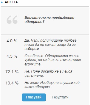 Почти поравно са разделени читателите ни, които вярват изцяло или частично на обещания. 4,5% са кликнали върху отговора „Колебая се. Обещанията са все хубави, но май не ги изпълняват всичките", а 4 на сто са посочили „Да. Нали политиците трябва някак да ни кажат защо да ги изберем".