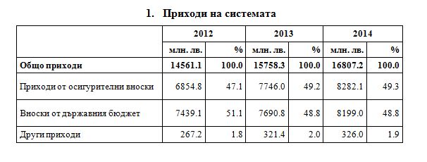 Финансирането на социалната защита в България се осъществява чрез социално- осигурителни вноски или чрез пряко финансиране от държавния бюджет. През 2014 г. приходите от държавния бюджет за финансиране на социалната защита в страната са в размер на 8 199.0 млн. лв., а приходите от осигурителни вноски - 8 282.1 млн. лева. Спрямо предходната година се наблюдава увеличение на приходите от осигурителни вноски с 6.9%, а от вноските от държавния бюджет с 6.6%.