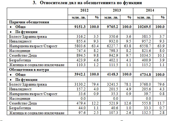 Над 60% от паричните обезщетения се изплащат по функция „Навършена възраст/Старост" (табл. 3), като основната част от тях не се свързва с изискването за покриване на допълнителни условия при получаването им, тъй като са резултат от участие в социалноосигурителната система. Значителен дял заемат паричните обезщетения, изплащани по функции „Инвалидност" (9.3%) и „Семейство/Деца" (10.1%).