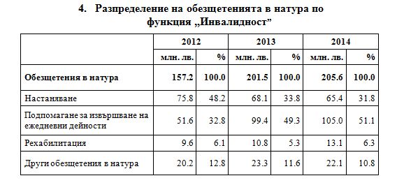 През 2014 г. разходите по функция „Инвалидност" са в размер на 1 162.8 млн. лв., или 7.7% от общо изплатените обезщетения за социална защита. 82.3% от обезщетенията по функцията са в парична форма. Периодичните парични обезщетения обхващат пенсии за инвалидност, добавка за чужда помощ и месечни добавки за интеграция на хората с увреждания. Преобладаващ дял (70.3%) от паричните обезщетения по функцията заемат разходите за пенсии за инвалидност, а за месечни добавки за социална интеграция на инвалидите се отделят 14.1%. Еднократните суми в размер на 50.0 млн. лв. са предназначени за финансиране на проекти за трудова реализация на хора с увреждания, както и за целеви помощи за хора с увреден слух или увредено зрение.