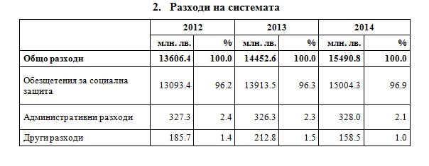 През 2014 г. разходите за социална защита са 15 490.8 млн. лв. (табл. 2), което представлява около 18.9% от брутния вътрешен продукт на страната за същата година. Разходите за социални обезщетения остават с най-висок дял от общите разходи (96.9%). За управление на схемите (административни разходи) и за други разходи се отделят съответно 2.1 и 1.0% от общите разходи.