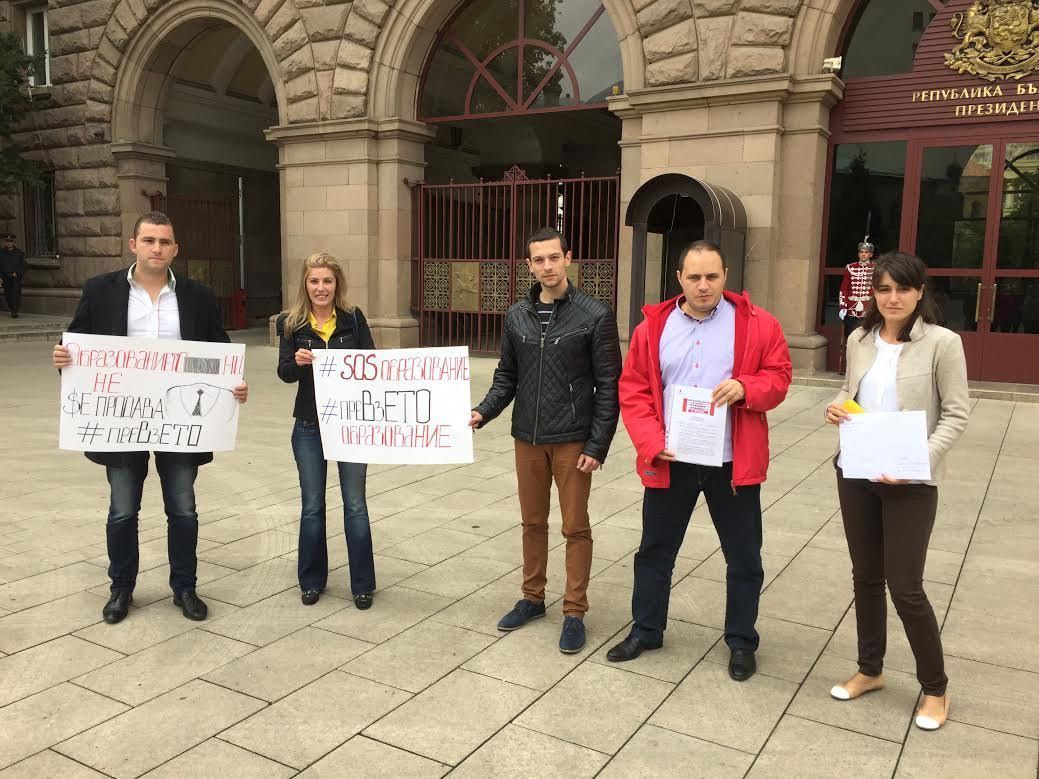 /КРОСС/Младежи от БСП се събраха днес пред сградата на президентството на протест срещу направените от управляващите промени в Закона за училищното и предучилищното образование. Te изпратиха в плик спасителен пояс до президента Плевнелиев с призив да спаси образованието, като наложи вето върху закона. Присъстващите издигнаха и плакати с надписи: SOS Образование; Образованието не $е продава! и кръстиха акцията си „преВзЕТО образование".