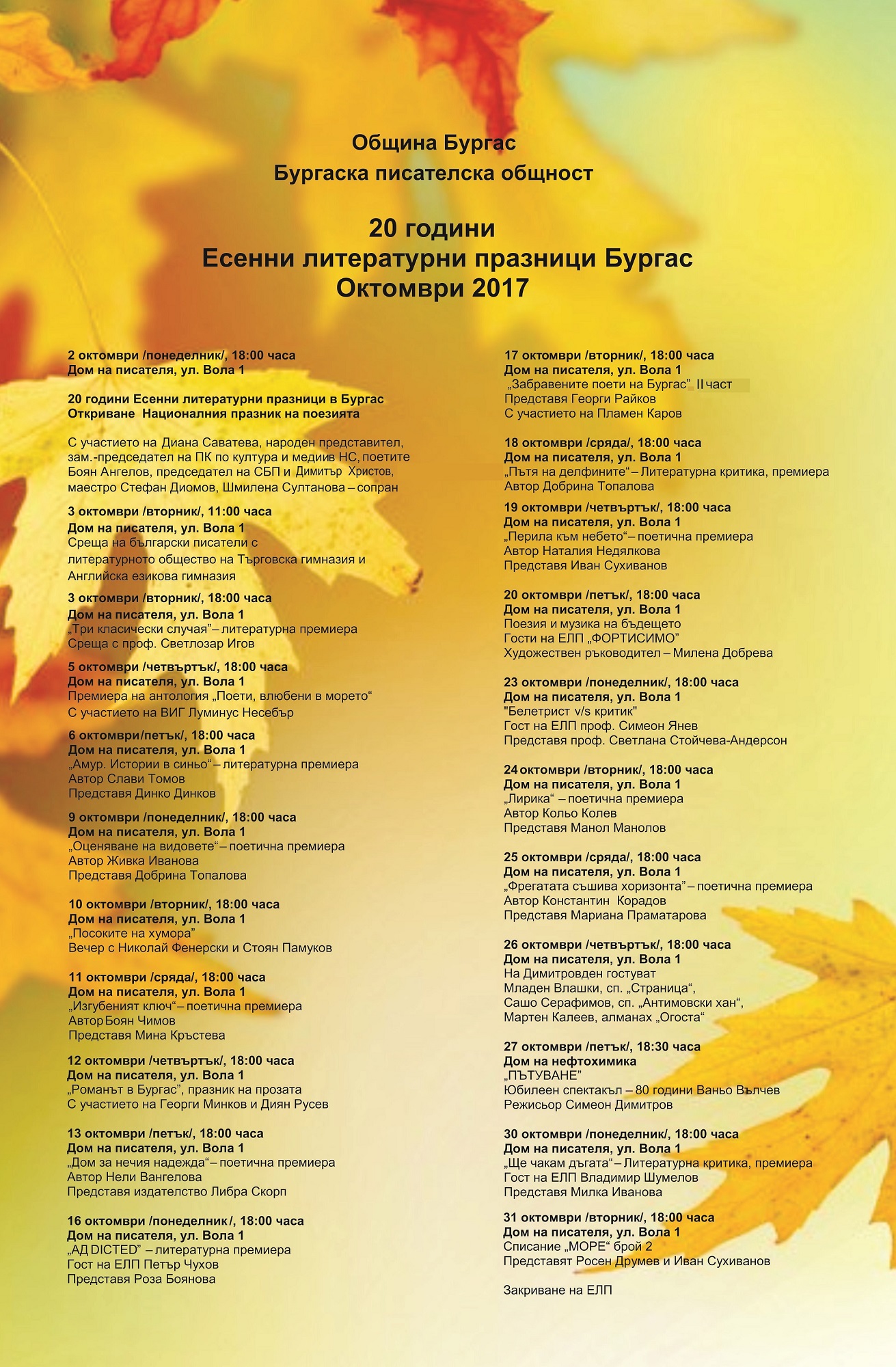 Първото събитие след официалното откриване на 2 октомври е среща на български писатели с литературното общество на Търговска гимназия и Английска гимназия. И в тазгодишното издания на Есенните литературни празници са предвидени тематични вечери - "Посоките на хумора" с писателя Николай Фенерски и актьора Стоян Памуков на 1- октомври, празник на прозата, озаглавен "Романът в Бургас" с участието на Георги Минков и Диян Русев на 12 октомври.