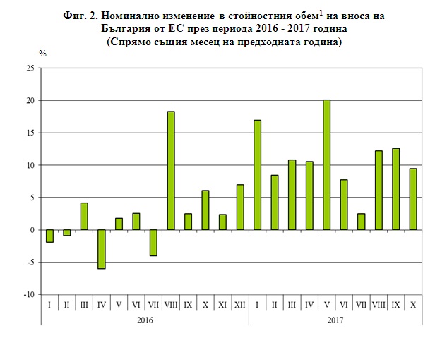 Вносът на България от ЕС през периода януари - октомври 2017 г. се увеличава с 10.9% спрямо същия период на 2016 г. и е на стойност 30 838.7 млн. лв. по цени CIF (табл. 1 и 2 от приложението). Най-голям е стойностният обем на стоките, внесени от Германия, Италия, Румъния, Испания и Гърция .