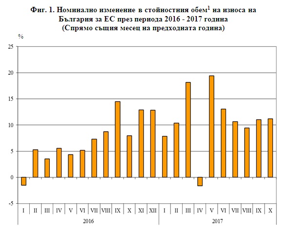 През октомври 2017 г. износът за ЕС нараства с 11.2% спрямо същия месец на предходната година и е в размер на 3 226.5 млн. лева.