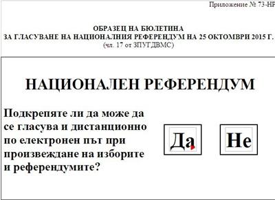 Въпросът, на който избирателите ще могат да отговарят - "Подкрепяте ли да може да се гласува дистанционно по електронен път при произвеждане на изборите и референдумите?" е поставен вляво на бюлетините. Вдясно са двата възможни отговора - "да" и "не".