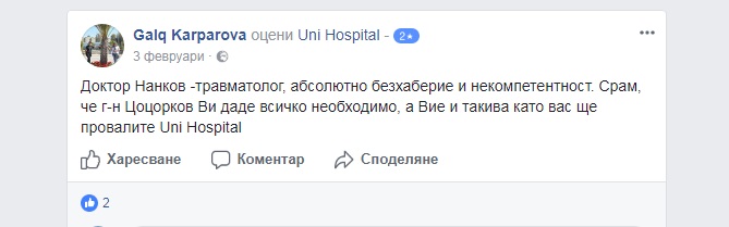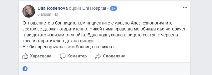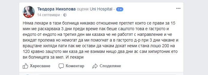 На страницата на лечебното заведение се появиха и по чудо не бяха изтрити негативните коментари и разказите на пациенти от първо лице. Хората се оплакват от лошо отношение, забавяне и безкрайно чакане за елементарни прегледи и некадърността на кадри на „Уни Хоспитал".