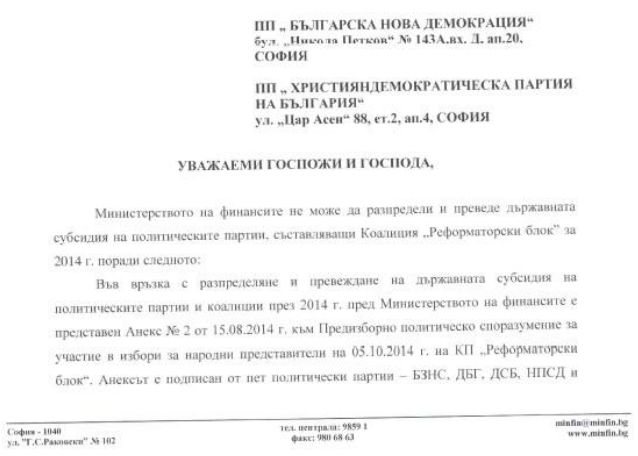 Факсимиле от писмото на Министерство на финансите от 1 декември 2014 г. до седемте партии от Коалиция Реформаторски блок.