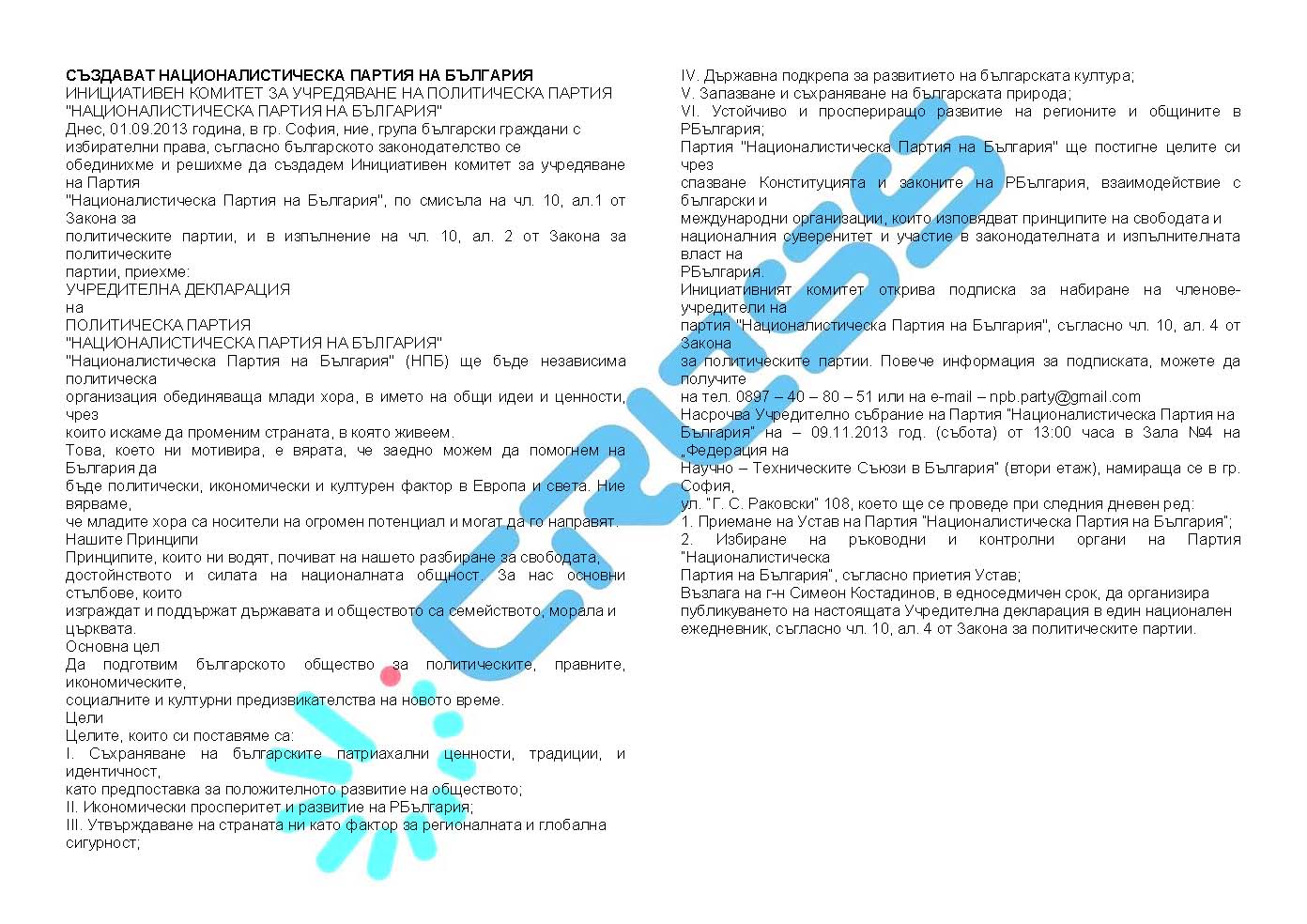 На 1 септември тази година група български граждани създадоха Инициативен комитет за учредяване на Партия "Националистическа Партия на България" като „независима политическа организация, обединяваща млади хора, в името на общи идеи и ценности, чрез които да се промени страната ни".