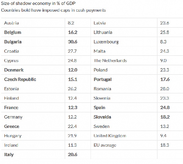 Така например държавата с най-ниско ниво на сивата икономика Австрия не лимитира по никакъв начин плащанията на своя територия, докато страната с най-висок дял от БВП на сивия сектор - България, таван за кешовите плащания съществува от 2011 г.