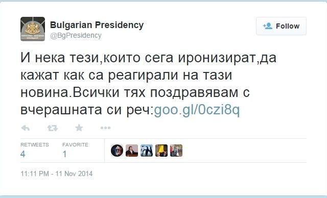 /КРОСС/ „10 ноември е възприеман като символична дата за началото на прехода, а не просто квадратче от календара. Имах смелостта да изляза с ясна гражданска позиция. Днес някои се опитват да обърнат тази истина срещу мен", написа президентът Росен Плевнелиев в профила си в Twitter.
