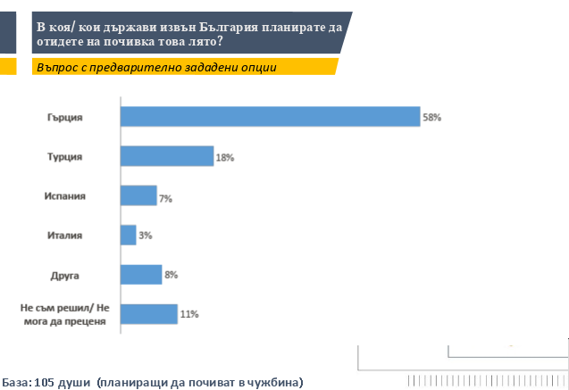 За планиращите да ходят в чужбина на почивка това лято, най-предпочитаното място е Гърция (58%), а след това е Турция (18%). Близостта на двете ни съседки е едно възможните обяснения за тези нагласи, както и икономически по-изгодните оферти, които предлагат двете държави. Всеки трети от планиращите да почива в чужбина обаче посочва, че основната причина да избере да почива извън България, са по-качествените туристически услуги. Всеки пети пък намира по-добри ценови оферти от тези в България.