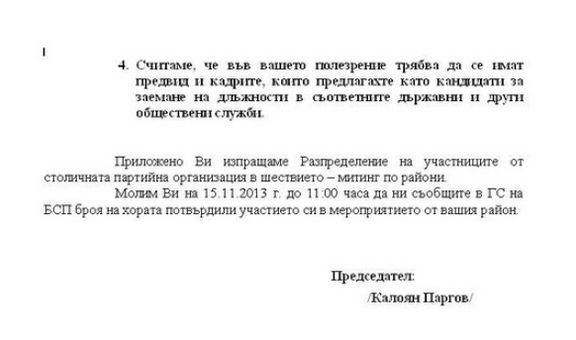 „Считаме, че във вашето полезрение трябва да се имат предвид и кадрите, които предлагахте като кандидати за заемане на длъжности в съответните държавни и други обществени служби", пише в окръжното на Паргов.