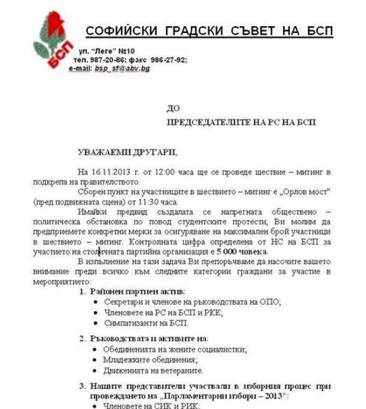 София /КРОСС/ Всички кандидати за държавни и обществени служби да бъдат мобилизирани за митинга на БСП в подкрепа на правителството в събота, 16 ноември.