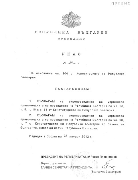 Излезем ли от Указ № 13, отиваме при някое от другите определения за вицепрезидента. Но пък останем ли в рамките на указа, няма как Бареков и близките му медии да продължат да я промотират за президент, който аха, ей сега ще заеме мястото на избрания от българите държавен глава.