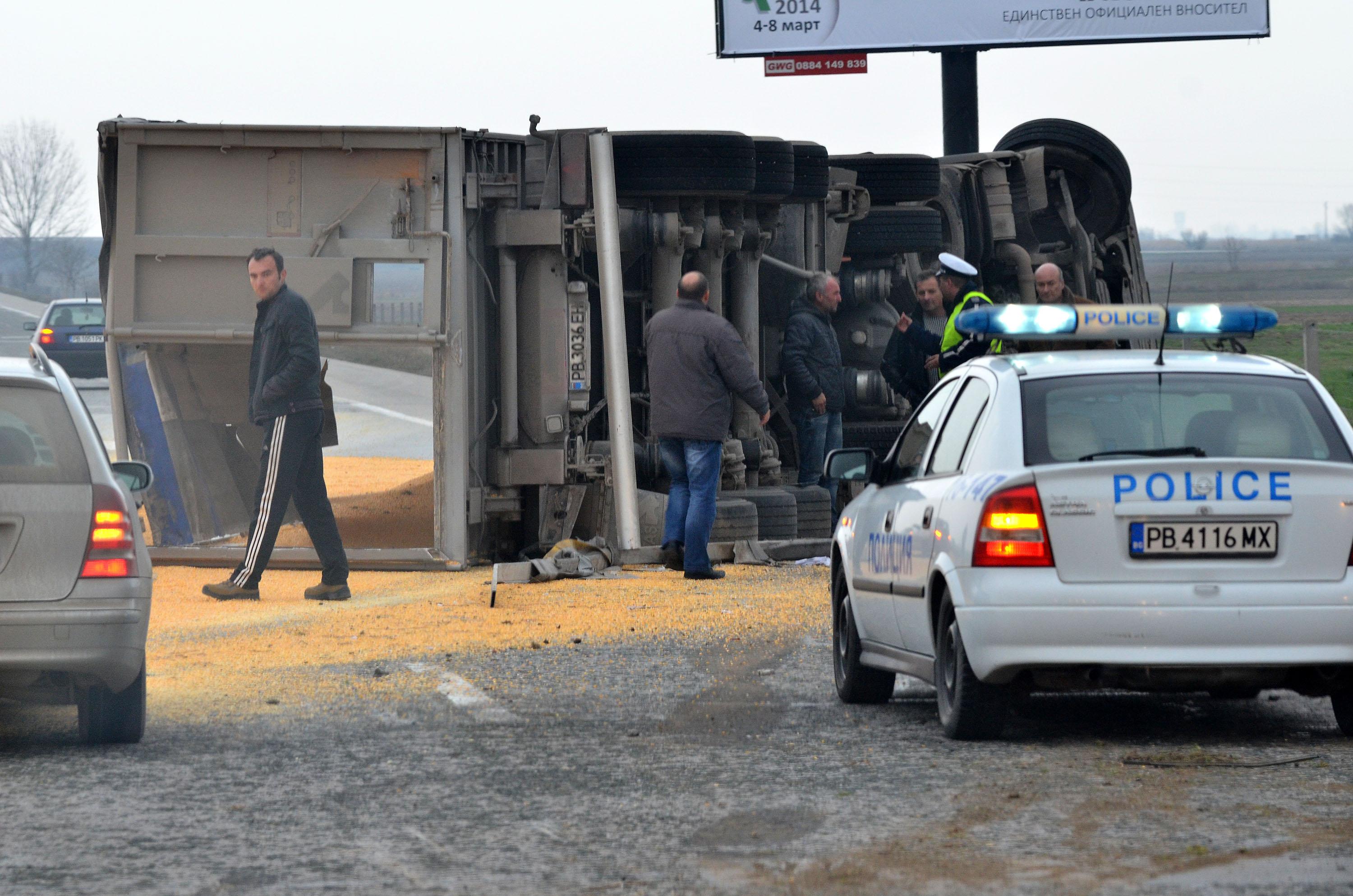 /КРОСС/ Зърновоз се е обърнал напряко на платното на магистрала "Тракия". Инцидентът е станал при 145 километър в посока Бургас. Освен тежкия камион в катастрофата е участвал и лек автомобил "Опел", който пък се намира на платното в посока София.
