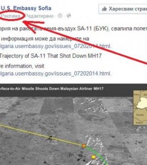 /КРОСС/ Американското посолство в София пусна платена реклама във Фейсбук, с която обяснява траекторията на ракетата, която според американците е свалила малайзийския „Боинг".