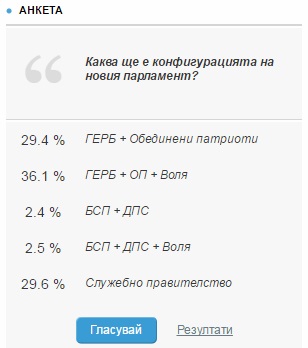 Едва 2,5 на сто гласуваха, че БСП, ДПС и „Воля" ще договарят новото правителство, а 2,4% отговориха, че в Министерски съвет ще влязат БСП и ДПС.