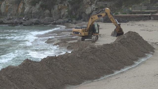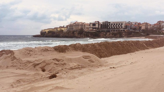 /КРОСС/ Пясъчни диги, които да предпазват плажовете от разрушаване през зимата, се правят от години. В момента на плажа в Несебър багер натрупва огромни купчини пясък по протежение на плажната ивица.
