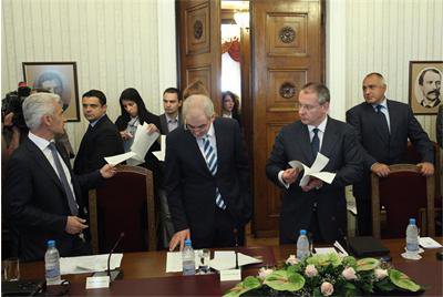 Лидерите на ГЕРБ, БСП, ДПС и „Атака" - Бойко Борисов, Сергей Станишев, Лютви Местан и Волен Сидеров пристигнаха на „Дондуков"2. С тях при държавния глава влязоха и председателят на Народното събрание Михаил Миков, министърът на вътрешните работи Цветлин Йовчев, премиерът Пламен Орешарски и други министри и народни представители.