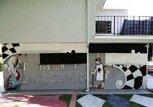 Фасадата на сградата се украсява от скулптура във формата на Белия заек - друг герой от книгата, а останалите стени са украсени с цитати.